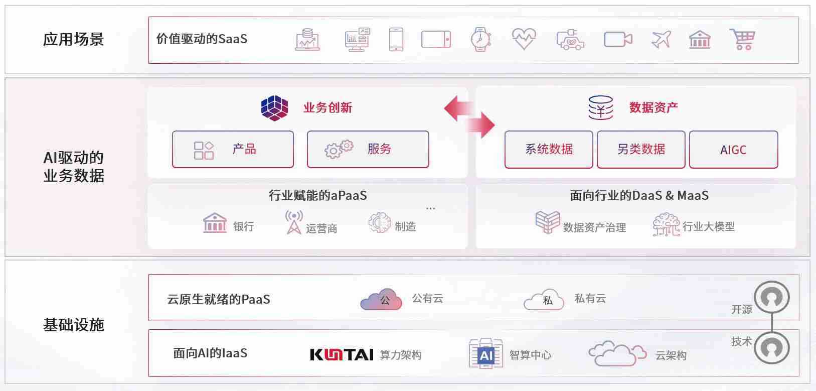 数字时代,,,,围绕企业数字化转型的关键要素,,,,尊龙旗舰厅数码开创性的提出数云融合战略和技术体系框架,,着力在云原生、、数字原生、、、、AI原生和信创产业上架构产品和服务能力,,为处在不同数字化转型阶段的快消零售、、、汽车、、金融、、、、医疗、、、政企、、教育、、、、运营商等行业客户提供泛在的敏捷IT能力和融合的数据驱动能力,,,,构建跨界融合创新的数字业务场景和新业务模式,,,,助力企业级客户建立面向未来的核心能力和竞争优势,,全面推动社会的数字化、、智能化转型升级。。。